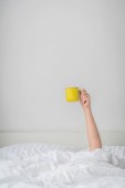 Kobieta pokazuje ramię podniesione trzymając filiżankę kawy na łóżku w sypialni
