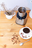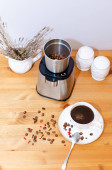 Elektryczna młynek do kawy mielenie ziaren kawy i stojąc na stole, filiżanka czarnej kawy. Rytuał porannej kawy.