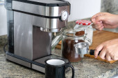 Zdjęcie "Elektryczna młynek do kawy mielenie ziaren kawy i stojąc na stole, filiżanka czarnej kawy. Rytuał porannej kawy." może być wykorzystywane do celów osobistych i komercyjnych zgodnie z warunkami zakupionej licencji Royalty-free. Obraz jest dostępny do pobrania w jakości wysokiej rozdzielczości do 5760x3840.