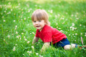 uśmiechnięta dziewczynka stoi w bujnych zielonych krzakach