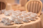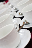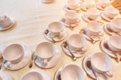 Koncepcja herbaty, filiżanek ze spodkami i łyżeczkami na stole z białym obrusem.