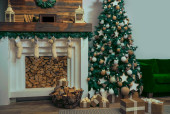 Zdjęcie "Wnętrze eco style.decorated wnętrze kanapy i choinki, nowoczesne i przytulne. Szczęśliwego Nowego Roku i Wesołych Świąt. Pokój Design z choinką, sofą i kominkiem. " może być wykorzystywane do celów osobistych i komercyjnych zgodnie z warunkami zakupionej licencji Royalty-free. Obraz jest dostępny do pobrania w jakości wysokiej rozdzielczości do 5760x3840.