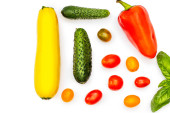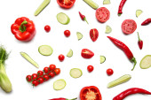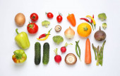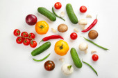 Różne świeże warzywa na białym tle, widok z góry