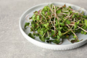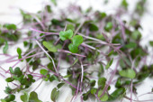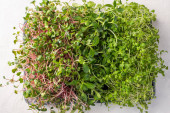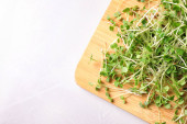 Świeże organiczne mikrozielone na białym stole, widok z góry. Miejsce na tekst