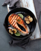 Zdjęcie "Łosoś z grilla ze świeżą sałatką. Helathy koncepcja jedzenia. Widok z góry" może być wykorzystywane do celów osobistych i komercyjnych zgodnie z warunkami zakupionej licencji Royalty-free. Obraz jest dostępny do pobrania w jakości wysokiej rozdzielczości do 5760x3840.