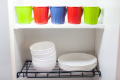 Zdjęcie "Czyste naczynia w odcieniach bieli i zieleni w suszarce. Kubki, szklanki, kubki, talerze, miski, talerze na metalowych półkach. Koncepcja wnętrza kuchni, stylu życia, higieny, życia codziennego. Widok boczny." może być wykorzystywane do celów osobistych i komercyjnych zgodnie z warunkami zakupionej licencji Royalty-free. Obraz jest dostępny do pobrania w jakości wysokiej rozdzielczości do 5760x3840.