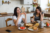 Brunetka dziewczyna w białym T-shirt w kuchni jeść jabłko.