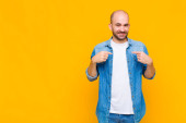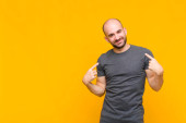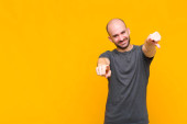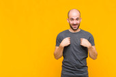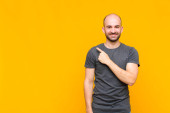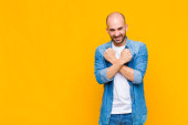 Zdjęcie "łysy mężczyzna uśmiecha się radośnie dając ciepły, przyjazny, kochający uścisk powitalny, czując się szczęśliwy i uroczy" może być wykorzystywane do celów osobistych i komercyjnych zgodnie z warunkami zakupionej licencji Royalty-free. Obraz jest dostępny do pobrania w jakości wysokiej rozdzielczości do 5760x3840.