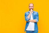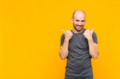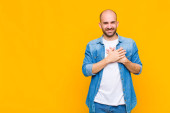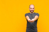 łysy mężczyzna uśmiecha się radośnie dając ciepły, przyjazny, kochający uścisk powitalny, czując się szczęśliwy i uroczy
