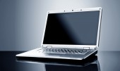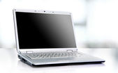 nowoczesny laptop na białym tle z odbicia na stół szkło.