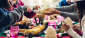 Portret szczęśliwej dużej rodziny świętującej zabawę i jedzącej jedzenie na wspólnym lunchu cieszącej się razem spędzaniem czasu w domu