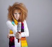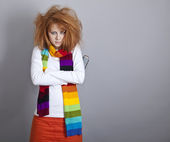 portret śmieszne dziewczyny w blond peruce.