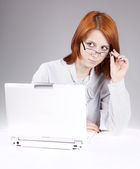 portret śmieszne dziewczyny w blond peruce z laptopa.