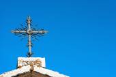 Rzeźbiony drewniany krzyż chrześcijański na dachu starożytnego kościoła klepkowego. - Tak. Wysokiej jakości zdjęcie