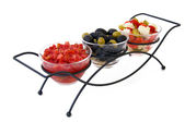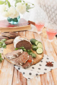 czerwony kawior w misce i wódki na desce, na na białym tle serwetka