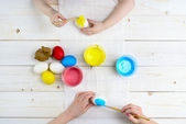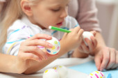 polowanie na rękach malucha chłopiec malowanie kolorowe jajka na Wielkanoc