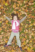 kłamliwy w dół dziewczynka w trawy i liści w parku.