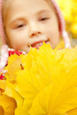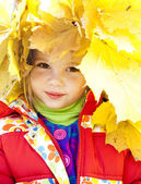 kłamliwy w dół dziewczynka w trawy i liści w parku.