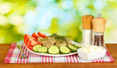 Kompozycja z kieliszek wódki i grzyby marynowane, ogórki na drewniane tła