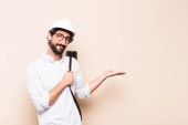 młody łysy mężczyzna uśmiecha się radośnie, czując się szczęśliwy i pokazując koncepcję w przestrzeni kopiowania z dłoni