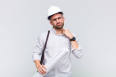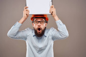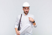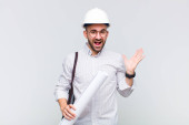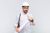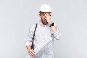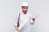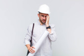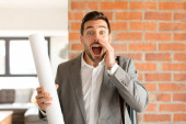młody łysy człowiek uczucie szoku i strachu, patrząc przerażony z otwartymi ustami i rękami na policzkach