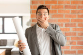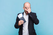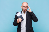 Zdjęcie "młody łysy człowiek uczucie szoku i strachu, patrząc przerażony z otwartymi ustami i rękami na policzkach" może być wykorzystywane do celów osobistych i komercyjnych zgodnie z warunkami zakupionej licencji Royalty-free. Obraz jest dostępny do pobrania w jakości wysokiej rozdzielczości do 5760x3840.