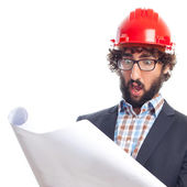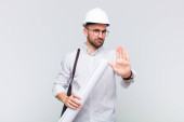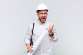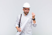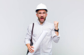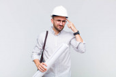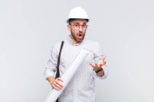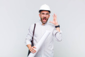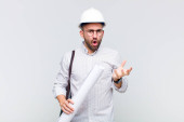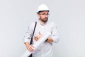 młody łysy mężczyzna wygląda zaskoczony i zszokowany, z opuszczoną szczęką trzymając obiekt z otwartą ręką na boku