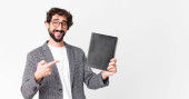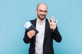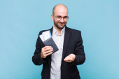 Zdjęcie "młody łysy mężczyzna uśmiecha się radośnie, czując się szczęśliwy i pokazując koncepcję w przestrzeni kopiowania z dłoni" może być wykorzystywane do celów osobistych i komercyjnych zgodnie z warunkami zakupionej licencji Royalty-free. Obraz jest dostępny do pobrania w jakości wysokiej rozdzielczości do 5760x3840.