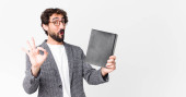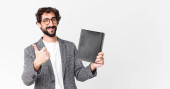 młody łysy mężczyzna uśmiecha się radośnie, czując się szczęśliwy i pokazując koncepcję w przestrzeni kopiowania z dłoni
