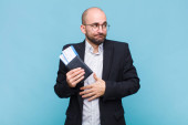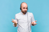 młody łysy mężczyzna smutny i jęczący z nieszczęśliwym spojrzeniem, płaczący z negatywnym i sfrustrowanym nastawieniem
