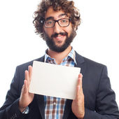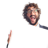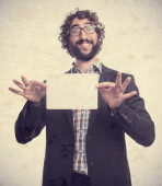 młody łysy mężczyzna czuje się jak szczęśliwy i podekscytowany geniusz po realizacji pomysłu, radośnie podnosząc palec, eureka!