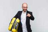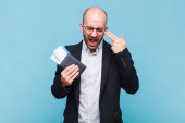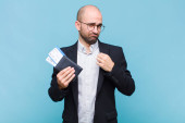 young bald man feeling puzzled and confused, with a dumb, stunned expression looking at something unexpected
