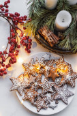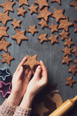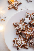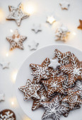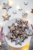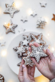 Ręce trzymają pierniki w postaci gwiazd i domów, posypane cukrem pudrem.
