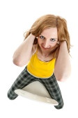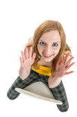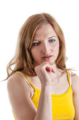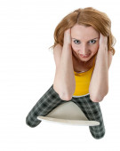 Pełna długość młodej kobiety leżącej na białym z rozciągniętymi blond włosami i ramionami skrzyżowanymi przed klatką piersiową w uniesionym widoku patrzącej poważnie w kamerę.