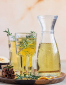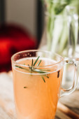 Bulion kostny lub warzywny, bulion w szklanym kubku i aromatyczne zioła na tle niebieskiego kamienia. Dieta paleonowa.