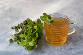Zdjęcie "Bulion kostny lub warzywny, bulion w szklanym kubku i aromatyczne zioła na tle niebieskiego kamienia. Dieta paleonowa." może być wykorzystywane do celów osobistych i komercyjnych zgodnie z warunkami zakupionej licencji Royalty-free. Obraz jest dostępny do pobrania w jakości wysokiej rozdzielczości do 5760x3840.