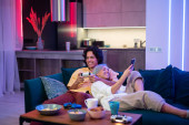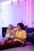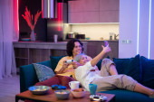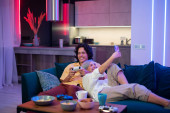 Zdjęcie "Dziewczyna streaming na żywo w Internecie z telefonu komórkowego, jak spędza czas z chłopakiem podczas samoizolacji w domu. Człowiek grający w gry wideo na konsoli do gier." może być wykorzystywane do celów osobistych i komercyjnych zgodnie z warunkami zakupionej licencji Royalty-free. Obraz jest dostępny do pobrania w jakości wysokiej rozdzielczości do 5760x3840.