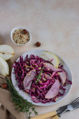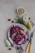 Czerwona kapusta, sałatka z gruszek i orzechów laskowych z sosem cytrynowym i oliwą z oliwek. Lekkie kamienne tło. Wegetariańskie jedzenie. Widok z góry.
