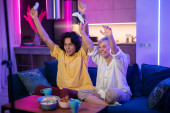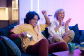 Szczęśliwi gracze grający w gry wideo w domu. Zwycięstwo w bitwie gratuluje sobie zwycięstwa. Facet z manicure trzyma joystick konsoli gier.
