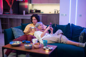 Zdjęcie "Szczęśliwi gracze grający w gry wideo w domu. Zwycięstwo w bitwie gratuluje sobie zwycięstwa. Facet z manicure trzyma joystick konsoli gier." może być wykorzystywane do celów osobistych i komercyjnych zgodnie z warunkami zakupionej licencji Royalty-free. Obraz jest dostępny do pobrania w jakości wysokiej rozdzielczości do 5760x3840.