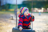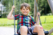 toddler biały chłopiec zabawy łańcucha huśtawka na zewnątrz gril
