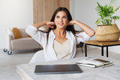 Atrakcyjna bizneswoman siedzi przy stole przed laptopem i rozmawia przez telefon komórkowy, negocjuje przez telefon.