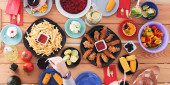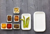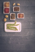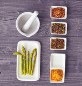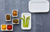 Świeże szparagi serwowane na białym talerzu z rustykalnym drewnianym tle tabeli, widok z góry.