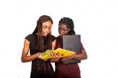 dwóch młodych czarny przyjaciele pracy tabletki mówić
