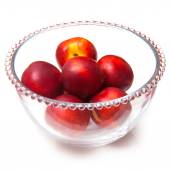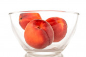 Brzoskwinie w misce szkła na białym tle na białym tle