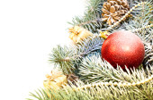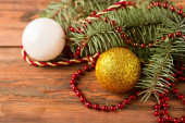 Nowy Rok Bożego Narodzenia śnieg na gałęzi z sosnowym dekoracji piłki płatki śniegu