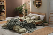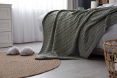 Wygodne łóżko z ciepłą dzianiną w stylowym wnętrzu pokoju