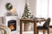 Świąteczne nakrycie stołu i piękny świąteczny wystrój w salonie. Projekt wnętrza