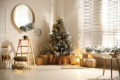 Zdjęcie "Świąteczne nakrycie stołu i piękny świąteczny wystrój w salonie. Projekt wnętrza" może być wykorzystywane do celów osobistych i komercyjnych zgodnie z warunkami zakupionej licencji Royalty-free. Obraz jest dostępny do pobrania w jakości wysokiej rozdzielczości do 5760x3840.