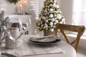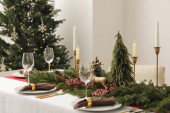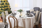 Świąteczne nakrycie stołu i piękny świąteczny wystrój w salonie. Projekt wnętrza